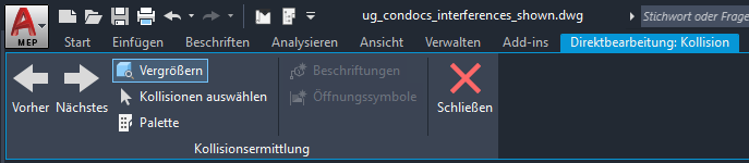 Automatisches Vergrößern von einer oder mehreren Kollisionen Klicken Sie in der Gruppe Kollisionsermittlung auf Vergrößern, um den Zoom-Modus umzuschalten, und wählen Sie dann mindestens eine Kollision in der Zeichnung aus.