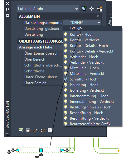 Außerdem können Sie höhenbasierte Darstellungskomponenten konfigurieren, die auf ein bestimmtes Objekt in der Zeichnung angewendet werden, indem Sie die Registerkarte Darstellung der Eigenschaftenpalette verwenden.