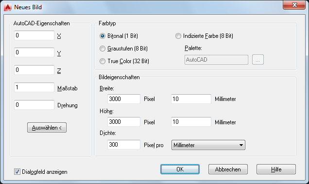 Wenn Sie das neue Bild erstellt haben, müssen Sie es speichern, um eine Verknüpfung zwischen der Zeichnung und der Bilddatei herzustellen. Um Eigenschaften für mehrere neue Bilder zu definieren, verwenden Sie die Registerkarte „Neues Bild“ im Dialogfeld AutoCAD Raster Design-Optionen.
