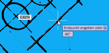 Dynamische Eingabe zeigt Eingabeaufforderungen an geeigneten Stellen an. Die Abbildung zeigt ein Beispiel für Eingabeaufforderungen, die Linienlänge und Winkel anzeigen, wenn Sie den Mauszeiger bewegen. Sie können auch einen numerischen Wert für die Linienlänge eingeben.