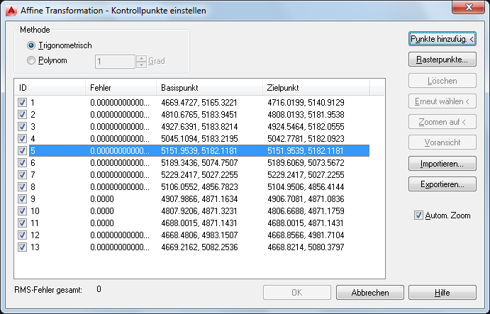 - Bei der Polynom-Methode werden die Kontrollpunkte verwendet, um eine einzelne Transformation auf der Grundlage des gesamten Bilds vorzunehmen. Bei der Polynom-Methode können jedoch nicht immer sämtliche Kontrollpunkte optimal miteinander abgeglichen werden.