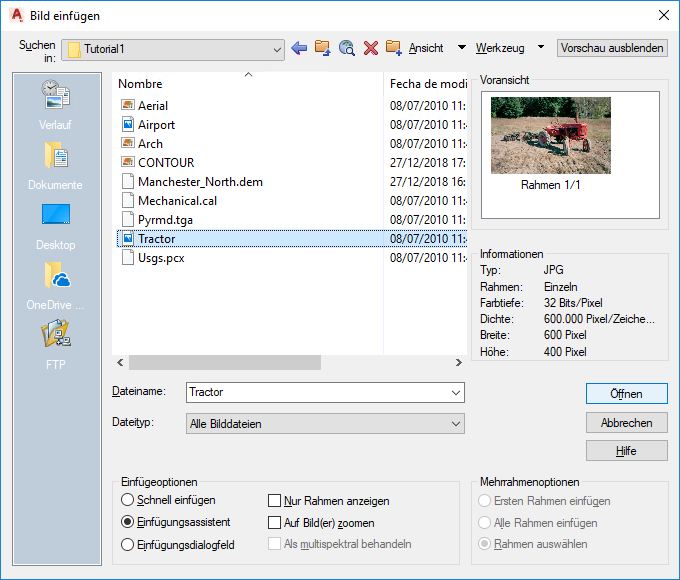 Einfügen klicken (oder iInsert in die Befehlszeile eingeben), wird das Dialogfeld Bild einfügen angezeigt. Hier können Sie eine Vorschau des Bilds und Informationen wie Dateityp, Farbtiefe und Dichte anzeigen. Bei der links im Dialogfeld Bild einfügen angezeigten Ordnerspalte handelt es sich um die Liste der Speicherorte. Sie enthält Verknüpfungen zu lokalen Ordnern, wie Favoriten oder Eigene Dokumente.