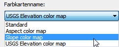 Wählen Sie im Dialogfeld Palettenzuordnung Farbkarte die Farbkarte Slope (Neigung) aus, und klicken Sie auf Anwenden. Die Farben der Karte geben nun die Bereiche der Bodenneigungswerte wieder. |