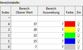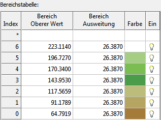 Im Dialogfeld Palette für Farbkarten-Definition sehen Sie in der Bereichstabelle, dass jede Farbe der Karte einen Erhebungsbereich von 86,57 m umfasst. Klicken Sie auf OK, um das Dialogfeld zu schließen. |