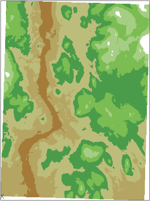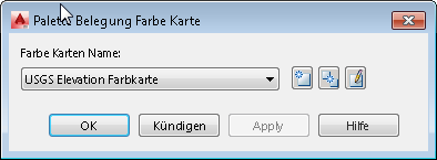 Öffnen Sie die Datei C:\Programme\Autodesk\AutoCAD Raster Design 2020\Getting Started Guide\LiveView_ColorMap.dwg Eine verschiedenfarbig gestaltete Geländekarte wird angezeigt. In den folgenden Schritten sehen Sie die Farbkarte zur Interpretation dieser Farben. |