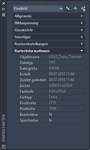 Dies ist ein Beispiel für den Inhalt des Fensters Eigenschaften bei einem ausgewählten Bild. Es ist ein Rasterbild ausgewählt, und die Bilddaten werden unten in der Eigenschaftenliste unter Informationen aufgeführt.