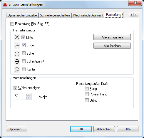 Wenn der Rasterfang aktiviert ist, wird ein Fangfenster um den AutoCAD-Cursor angezeigt. Das Fangfenster zeigt ein Fadenkreuz über Punkten an, die im Rasterfang festgehalten werden können. Durch Auswahl eines oder mehrerer Fangmodi können Sie festlegen, ob der Rasterfang auf Endpunkte, Ecken oder andere Punkte angewendet werden soll.