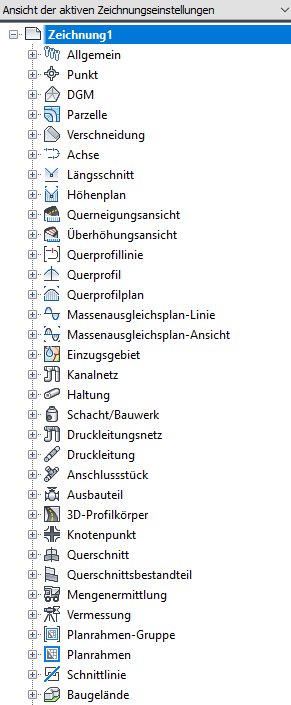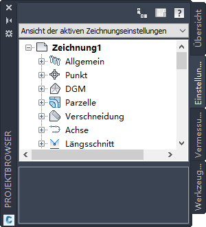 Auf der Registerkarte Einstellungen können Sie Stile für Autodesk Civil 3D-Objekte verwalten und Einstellungen für Zeichnungen und Befehle steuern.