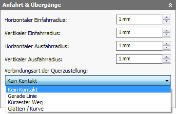 Der Übergangstyp wird auf der Registerkarte Verbindungen und Anfahr-Wegfahrbewegungen festgelegt.