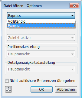 Express laden ermöglicht ein deutlich schnelleres Öffnen von Dateien mit großen Baugruppen (3-5fach schneller). Der Expressmodus bewirkt, dass optimierte Anzeigedaten (zwischengespeicherte Grafiken) in einer Baugruppendatei (.iam) gespeichert werden. Diese zusätzliche Daten, so genannte Expressdaten, ermöglichen Inventor, die Baugruppe schneller zu öffnen.