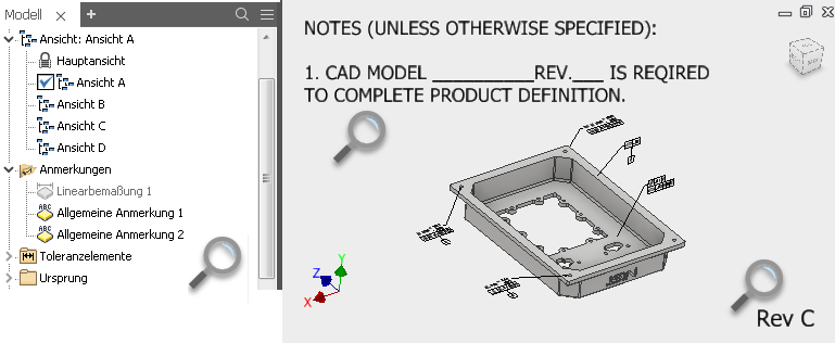 - Aktivieren Sie die Ansichten B, C und D, und deaktivieren Sie die Sichtbarkeit der Allgemeine Anmerkung 1 und 2.