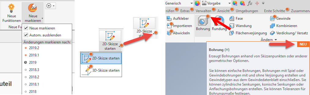 Wenn Sie für Befehle, die mit Neu oder Aktualisiert markiert sind, eine Hilfeseite mit F1 aufrufen, finden oben auf der Seite Links zum jeweiligen Thema Neue Funktionen, in dem die Änderung an der Funktion oder dem Befehl erläutert werden. Die Links zeigen die Version an, in der die jeweilige Änderung eingeführt wurde.
