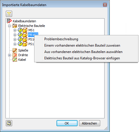- Erweitern Sie den Bereich Elektrische Bauteile, und wählen Sie im Dialogfeld Importierte Kabelbaumdaten ein elektrisches Bauteil aus.