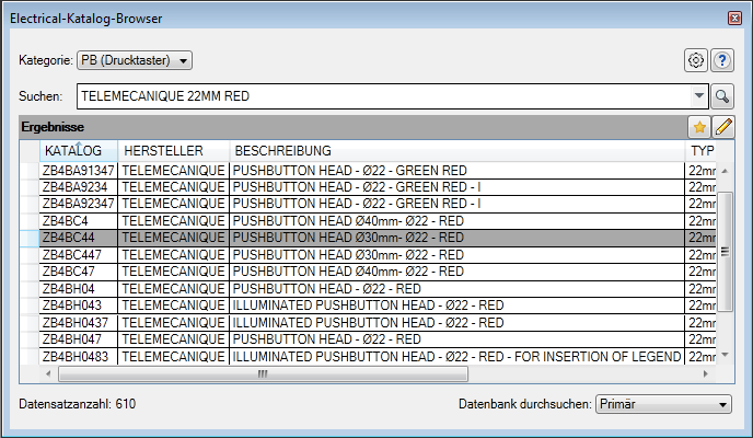 Wenn dem Bauteil ein Katalog zugewiesen ist, ist der Katalogwert im Electrical-Katalog-Browser bereits ausgewählt.