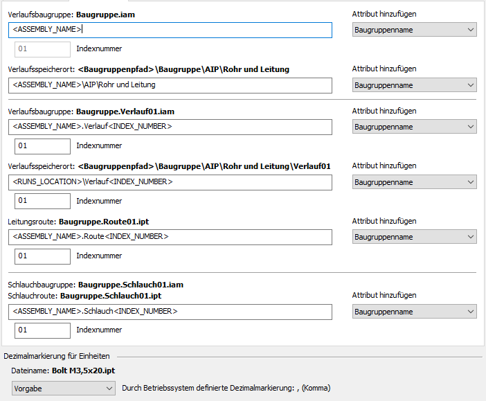 Geben Sie an, wie mit Rohr und Leitung Dateien und Ordner erstellt werden. Konfigurieren Sie das Benennungsschema mit den Optionen in der Dropdown-Liste Attribut hinzufügen.