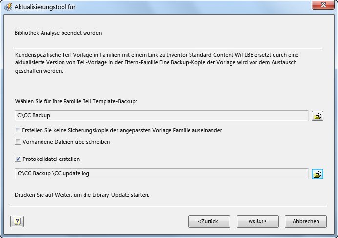 Eine Bibliotheksanalyse wird durchgeführt, und die Ergebnisse der Analyse werden angezeigt. Wenn Fehler auftreten, müssen diese zunächst behoben werden, bevor Sie den Vorgang fortsetzen können. Wenn keine Fehler auftreten, werden die Sicherungsoptionen angezeigt. Geben Sie einen Ordner für die Sicherungskopie an, und klicken Sie auf Weiter.
