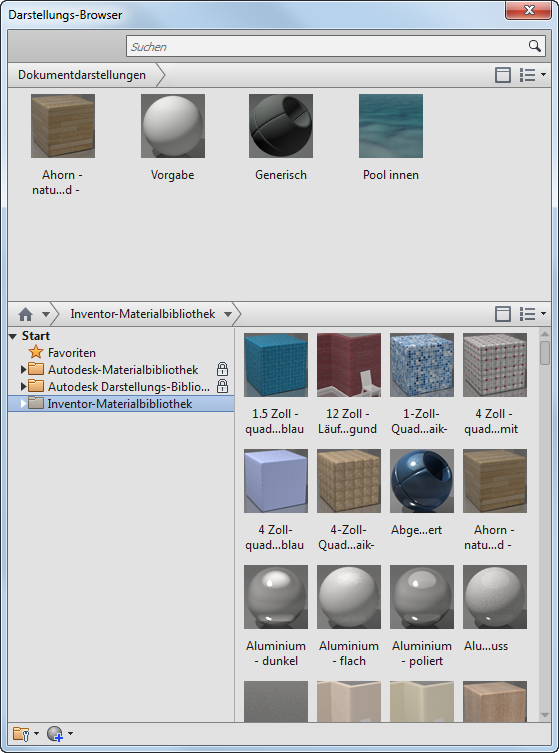 Darstellungen werden nach Typ aufgelistet, und jeder Typ verfügt über eindeutige Eigenschaften. Die Darstellungsdefinitionen enthalten Eigenschaften wie Farbe, Reflexionsvermögen, Transparenz, Selbstillumination, Muster, Texturbilder und Relief-Maps. Die Eigenschaften werden zu einer eindeutigen Darstellung kombiniert. Die einem Material zugewiesenen Darstellungen zählen zu den Objekten der Materialdefinition. Sie können mit Darstellungsobjekten die Darstellung überschreiben, die einem Material zugewiesen ist. Wenn beispielsweise ein Material aus Stahl wie Metall aussieht, überschreiben Sie die Darstellung mit einer Oberflächendarstellung, z. B. Chromierung, Eloxierung oder Lackierung.