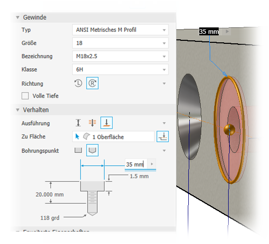 Gewindebohrungen wird eine Bohrung mit dem von Ihnen definierten Gewinde erstellt. Definieren Sie Gewindebohrungen in britischen oder metrischen Normgrößen. Für Bohrungselemente von Bauteilen können Sie aus einer Liste eine gängige Gewindegröße wählen. Der entsprechende Durchmesser wird dann automatisch berechnet.