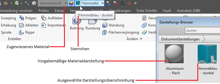 Anmerkung: Materialien verfügen über vorgegebene Darstellungszuweisungen. Beim Überschreiben der Darstellung wird ein Sternchen vor ihrem Namen im Schnellzugriff-Werkzeugkasten hinzugefügt. Dies soll darauf hinweisen, dass die zugewiesene Darstellung nicht die Standarddarstellung ist.