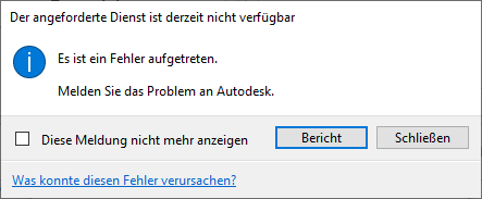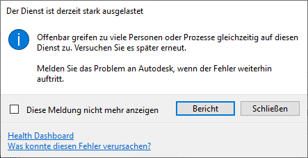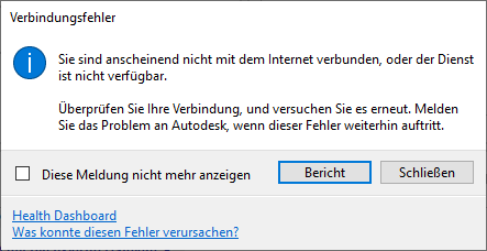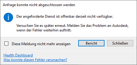 Wenn Sie mit dem Internet verbunden sind und dieser Fehler weiterhin auftritt, klicken Sie auf den Link zum Health Dashboard und überprüfen dann den Status des Diensts. Wenn im Health Dashboard angezeigt wird, dass der Dienst wie erwartet funktioniert, und Sie diese Meldung weiterhin erhalten, melden Sie das Problem dem Produktsupport von Autodesk. |