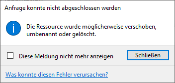 404, 410 | 1) Klicken Sie auf die Schaltfläche Schließen. 2) Aktualisieren Sie den Speicherort der Datei. 3) Versuchen Sie, erneut auf die Datei zuzugreifen.