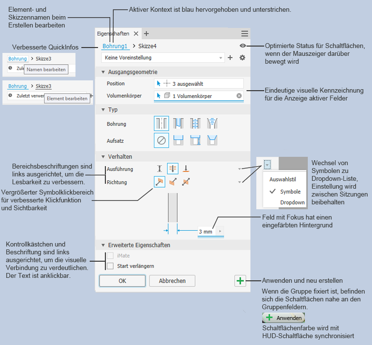 Allgemeine Verbesserungen an der Benutzeroberfläche und der grafischen Darstellung von Inventor.