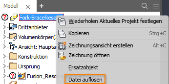 Wenn Sie eine Bauteil- oder Baugruppendatei mit fehlenden Referenzen zu einer oder mehreren AnyCAD-Dateien öffnen, wird das Dialogfeld Verknüpfung auflösen angezeigt, und Sie können die fehlende(n) Referenz(en) suchen. Wenn Sie unaufgelöste Referenzen überspringen, wird das Symbol Nicht aufgelöst neben dem obersten Browser-Knoten in der geöffneten Datei angezeigt. Sie können das Dialogfeld Verknüpfung auflösen erneut öffnen, indem Sie mit der rechten Maustaste auf den obersten Browser-Knoten klicken und die neue Option im Kontextmenü Datei auflösen auswählen.