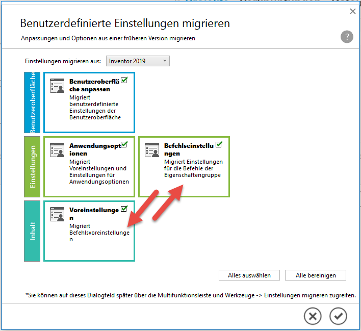 Bei der Installation einer neuen Version von Inventor können Sie bestimmte Einstellungen aus einer früheren Version migrieren. Wählen Sie aus, welche Gruppe von Einstellungen migriert werden soll.