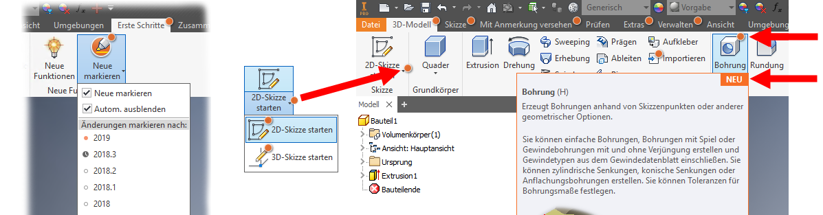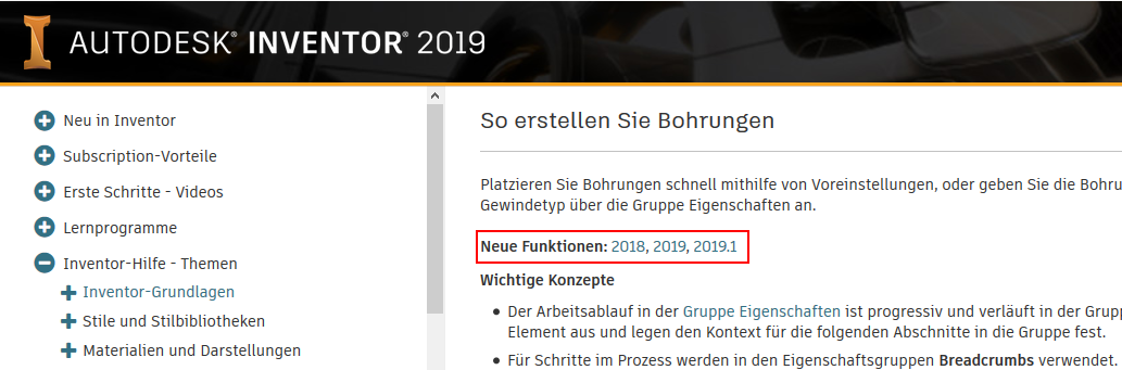 Wenn Sie mit F1 eine Hilfeseite aufrufen, werden außerdem - falls zutreffend - oben auf der Seite Links zum Thema Neue Funktionen angezeigt, unter denen die Funktion oder der Befehl erläutert werden.