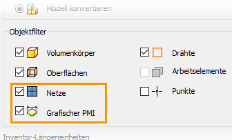 SolidWorks-Netzdaten können jetzt importiert werden. Aktivieren Sie im Dialogfeld im Abschnitt Objektfilter die Option Netze, um Netze aus der ausgewählten Datei einzuschließen. Weitere Informationen zum Arbeiten mit Netzdaten finden Sie unter Arbeiten mit Netzgeometrie.