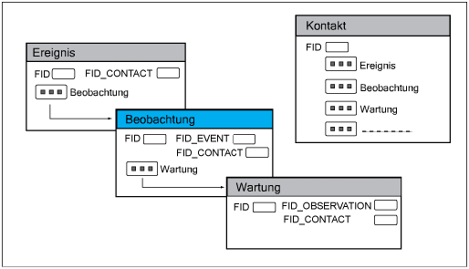 EL_EVENT. Speichert Ereignisse, z. B. Prüfungen, zusammen mit dem Ereignistyp und den Kontaktinformationen. Ein Ereignis kann verschiedenen Beobachtungen zugeordnet werden. Eine Beobachtung kann verschiedenen Wartungsaktivitäten zugeordnet werden. Die Beobachtung kann im Fall eines Schadensereignisses Prüfinformationen enthalten, und die Wartung kann Angaben zur Reparatur umfassen. Zugehörige Tabelle: EL_CONTACT |