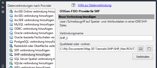 - Wählen Sie im Fenster Datenverbindung unter Datenverbindungen nach Provider (links) den Eintrag SHP-Verbindung hinzufügen.