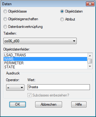 Wenn Sie einer Karte eine Zeichnung zuordnen, werden die Objekte nicht sofort in der Zeichnung angezeigt. Sie müssen sie zunächst abfragen. Die zugeordnete Zeichnungsdatei ist eine Karte von Kalifornien, in der jeder Bezirk durch ein Polygon dargestellt wird. Da die Stadt Redding im Bezirk Shasta liegt, fügen Sie die Grenzen des Bezirks Shasta zur Karte hinzu. Sie können Daten basierend auf dem Ort, den Eigenschaften oder den Daten abfragen. In diesem Fall führen Sie die Abfrage basierend auf dem Namen des Bezirks durch, der in den Objektdaten gespeichert ist.