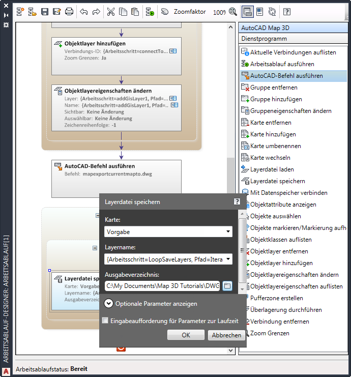 Um die Definition des Arbeitsablaufs abzuschließen, fügen Sie die Layer einer Gruppe hinzu und automatisieren einen AutoCAD-Befehl. Speichern und testen Sie anschließend den Arbeitsablauf.