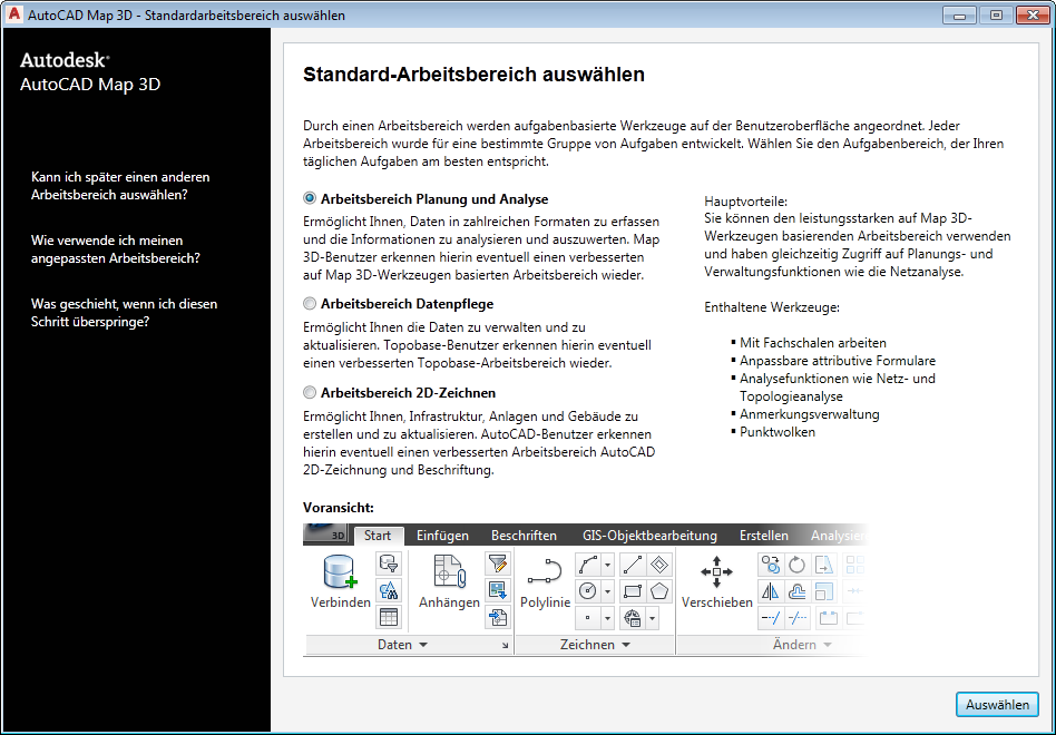 Wählen Sie den vorgegebenen Arbeitsbereich beim ersten Starten von AutoCAD Map 3D toolset.