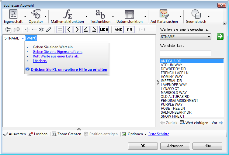 Die Eigenschaftenliste wird mit Daten versehen, wenn Sie auf den grünen Pfeil klicken. Der ausgewählte Wert wird durch Ihre Auswahl ersetzt.
