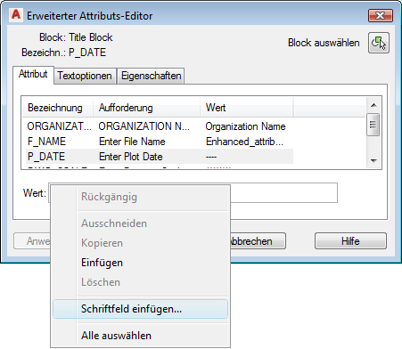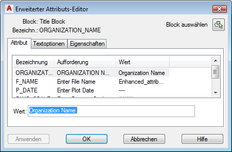 Doppelklicken Sie auf den Rahmen des Titelblocks, um den erweiterten Attribut-Editor anzuzeigen.