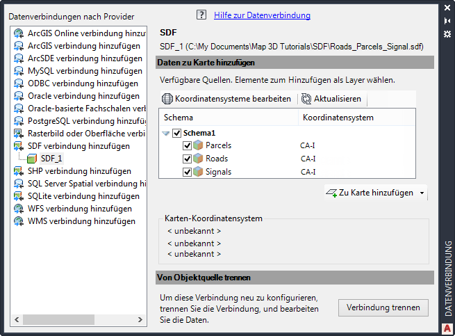 In dieser Übung stellen Sie eine Verbindung zu der neu erstellten SDF-Datei her und sehen die GIS-Objektklassen, die aus den drei Objektklassen erstellt wurden.