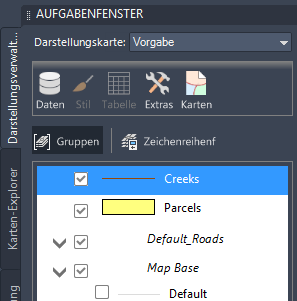 Auf der Registerkarte Darstellungsverwaltung werden die Layer in der aktuellen Karte angezeigt.