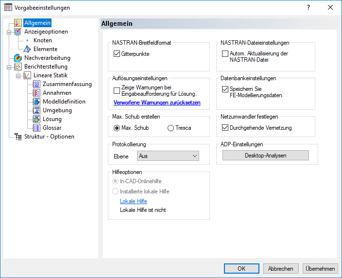 Vorgabeeinstellungen in der Autodesk Nastran-Multifiunktionsleistenregisterkarte.