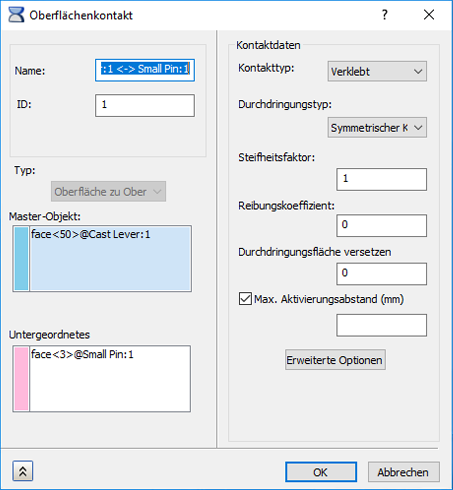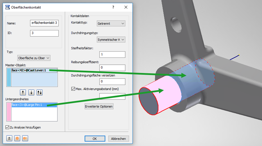 - Im Allgemeinen sollten Sie bei der manuellen Option für die Einrichtung des Kontakts als übergeordnete Fläche die Fläche mit der geringsten Krümmung bzw. bei zylindrischem Kontakt das äußere Segment wählen (und unsymmetrische Durchdringung wählen).