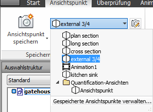 Klicken Sie auf Registerkarte Ansichtspunkt Gruppe Speichern, laden und wiedergeben Dropdown-Liste Gespeicherte Ansichtspunkte, und wählen Sie den zu überprüfenden Ansichtspunkt.