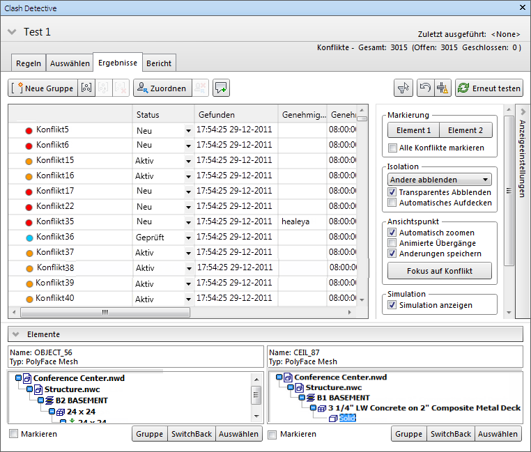 gekennzeichnet. Klicken Sie auf den Pfeil neben einer Konfliktgruppe, um zwischen dem Ein- und Ausblenden der Konflikte in der Gruppe umzuschalten. Wenn Sie ein Element in einem der Teilfenster des Bereichs Elemente auswählen und dann auf die Schaltfläche SwitchBack klicken, werden die aktuelle Ansicht und das derzeit ausgewählte Objekt zurück an das ursprüngliche CAD-Paket gesendet. Dadurch ist es sehr einfach, Konflikte in Autodesk Navisworks anzuzeigen, sie zurück in das CAD-Paket zu bringen, das Design zu ändern und wieder in Autodesk Navisworks zu laden. Auf diese Weise lassen sich Designs schnell überprüfen.