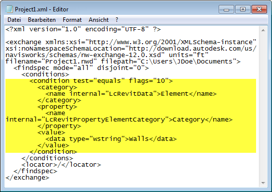 Kopieren Sie in der XML-Datei die Codezeilen, die dem oben gelb formatierten Bedingungsknoten entsprechen.