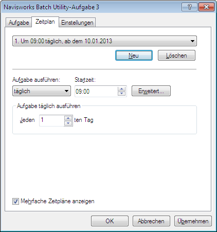 - Klicken Sie im Windows Taskplaner auf der Registerkarte Zeitplan auf die Schaltfläche Neu, und geben Sie den Zeitpunkt und die Häufigkeit zur Ausführung der Aufgabe an. Sie können eine beliebige Anzahl von Zeitplänen hinzufügen.