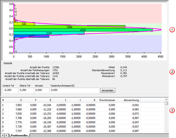 Statistik - Zeigt Informationen über die Punktewolke und die Anzahl der Punkte oberhalb, innerhalb und unterhalb der Toleranz an. Um die Toleranzen, Flächenversatz oder Tasterdurchmesser der Punktewolke zu ändern, geben Sie neue Werte in die entsprechenden Felder ein und klicken Sie dann auf Anwenden.