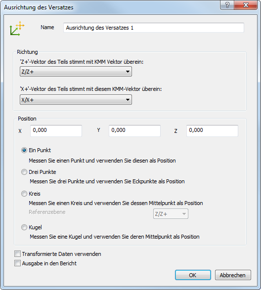 Mit der Ausrichtung des Versatzes können Sie ein Teil ausrichten, indem Sie eine einzelne festgelegte Position messen. Die Achsen des Bauteils müssen an den Achsen des Messgeräts ausgerichtet sein. Daher ist diese Funktion nur in Verbindung mit Koordinaten-Mess-Maschinen (KMM) geeignet.
