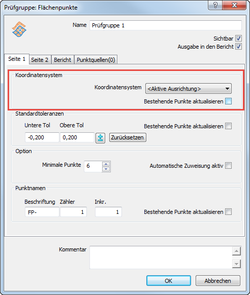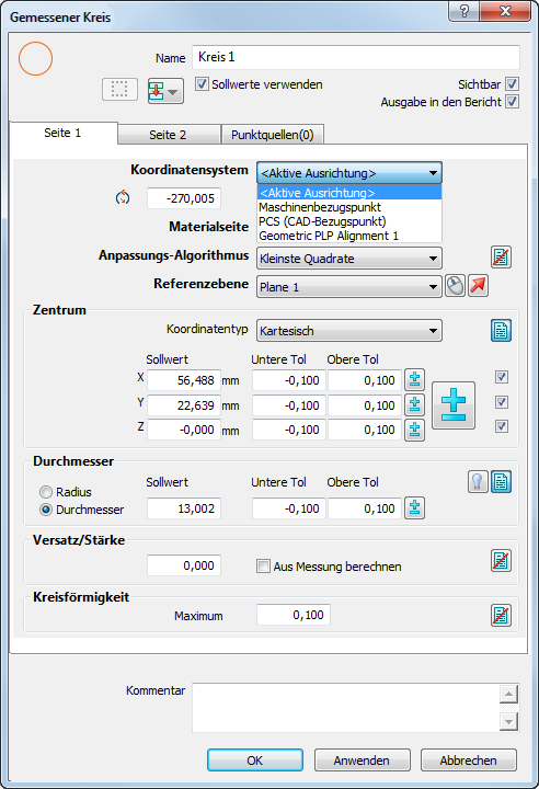 Wenn die Prüfsequenz nur eine Ausrichtung beinhaltet, lassen Sie die Liste Koordinatensystem auf der Vorgabeeinstellung <Aktive Ausrichtung> stehen. PowerInspect nutzt automatisch diese Ausrichtung oder das letzte Element bester Passung in der Prüfsequenz.