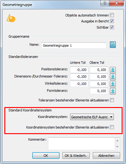 Alternativ können Sie eine Standardausrichtung für alle Elemente festlegen, die einer geometrischen Gruppe hinzugefügt wurden, indem Sie den Gruppen-Dialog öffnen und eine Ausrichtung in der Koordinatensystem-Liste auswählen. Wenn Sie das ausgewählte Koordinatensystem auf die bereits in der Gruppe bestehenden Elemente anwenden möchten, wählen Sie das Kontrollkästchen Koordinatensystem bestehender Elemente aktualisieren aus.