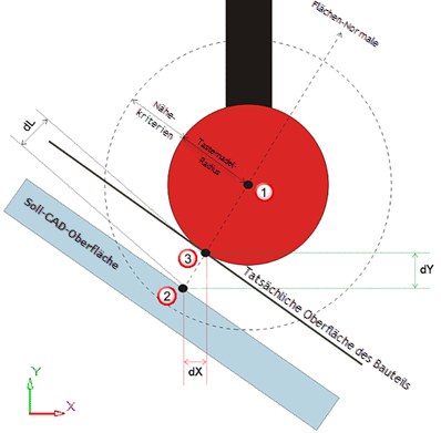 Der Mittelpunkt der Tastnadel. Dieser agiert als Mittelpunkt für die radiale Suche nach einem Kontakt. Der Radius der Suche entspricht dem Radius der Tastnadel plus den festgelegten Nähekriterien.